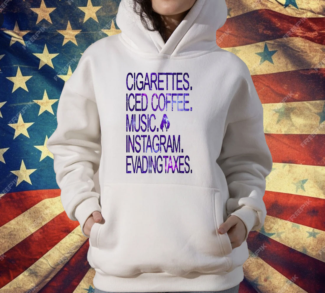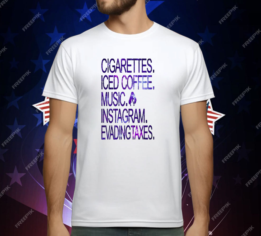 Cigarettes Iced Coffee Music Instagram Evading Taxes shirt, edgy meme graphic tee, ironic internet humor t-shirt, unisex streetwear apparel, Gen Z humor shirt, modern chaotic lifestyle tee, minimalist meme graphic shirt, soft cotton edgy t-shirt, viral internet culture shirt, high-quality sarcastic humor tee