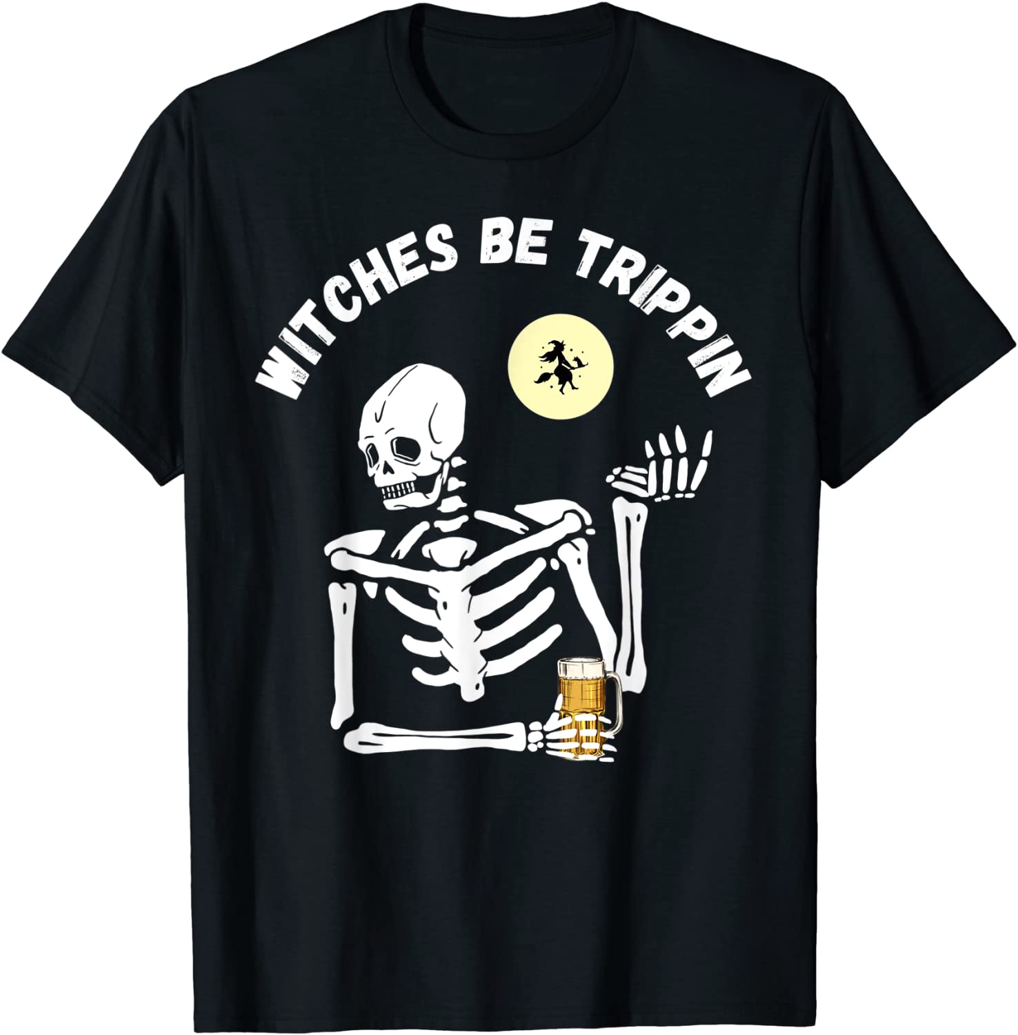 Classic Witches Be Trippin Funny Halloween Skeleton and Witch Pun T-Shirt