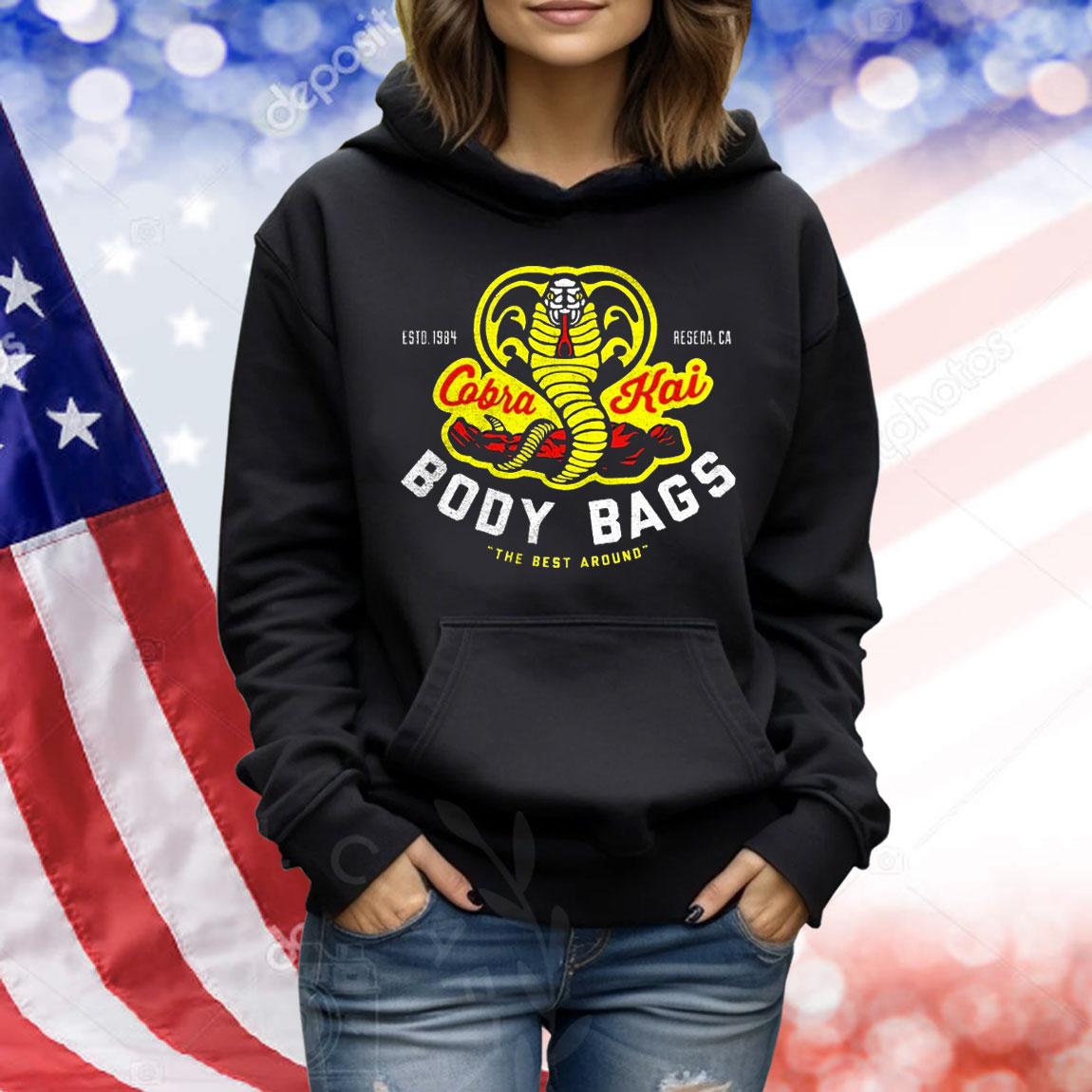Show your loyalty to the dojo with this fierce Cobra Kai Body Bags The Best Around Estd 1984 shirt. Inspired by the legendary Cobra Kai mantra, this tee channels the no-nonsense attitude and relentless spirit of the original karate dojo. Perfect for fans of the cult classic series, martial arts enthusiasts, or anyone who lives by the motto: Strike First. Strike Hard. No Mercy.