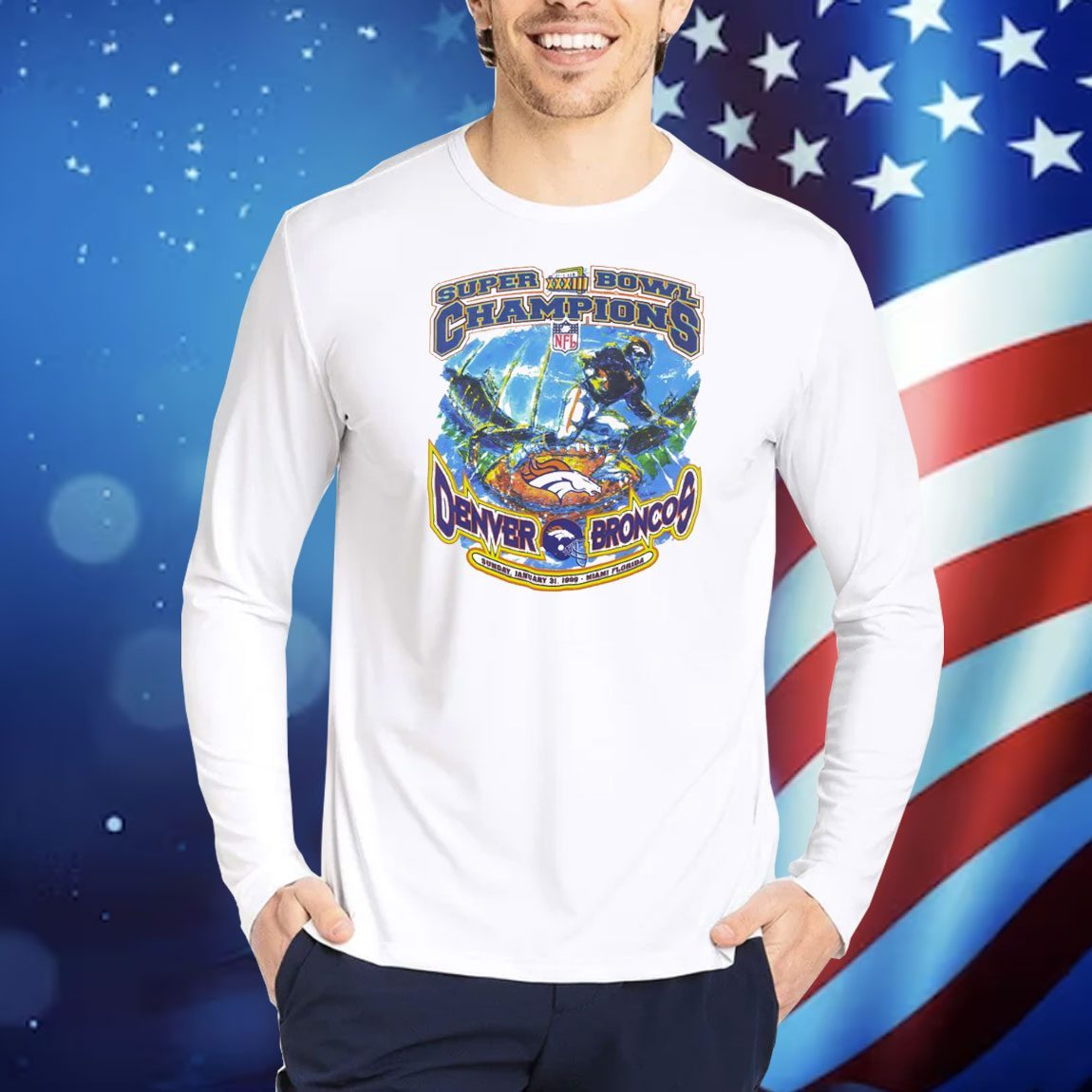 Relive the glory days of the Denver Broncos with this exclusive vintage shirt commemorating their historic Super Bowl XXXIII victory.