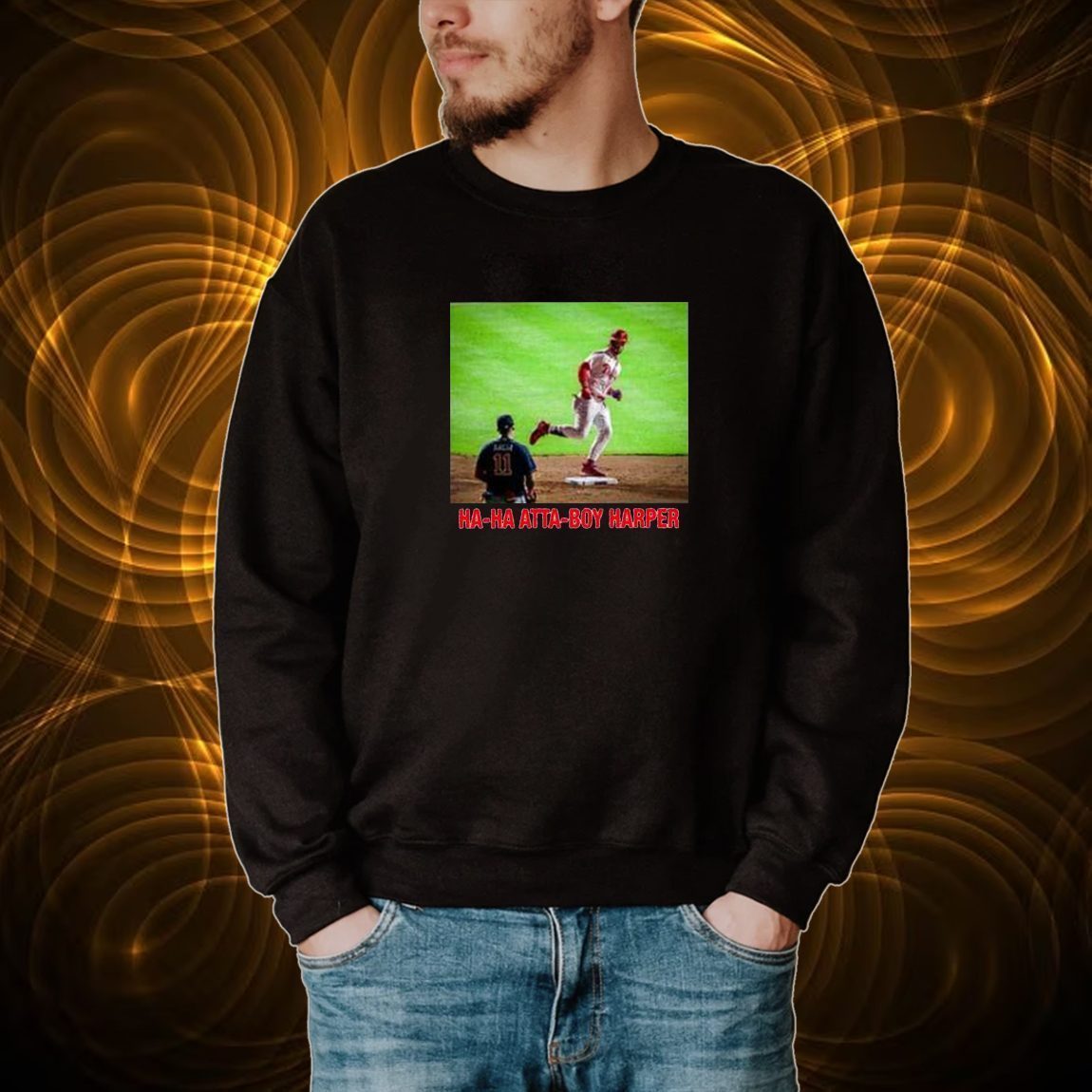 But what truly sets this t-shirt apart is its captivating design. The front proudly displays a vibrant and eye-catching graphic featuring Bryce Harper in action, capturing his dynamic presence on the field. The bold “Ha Ha Atta Boy Harper” slogan adds a touch of humor and personality, making it a conversation starter among fellow fans.