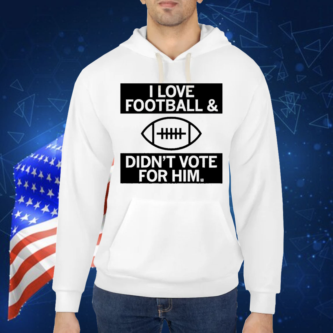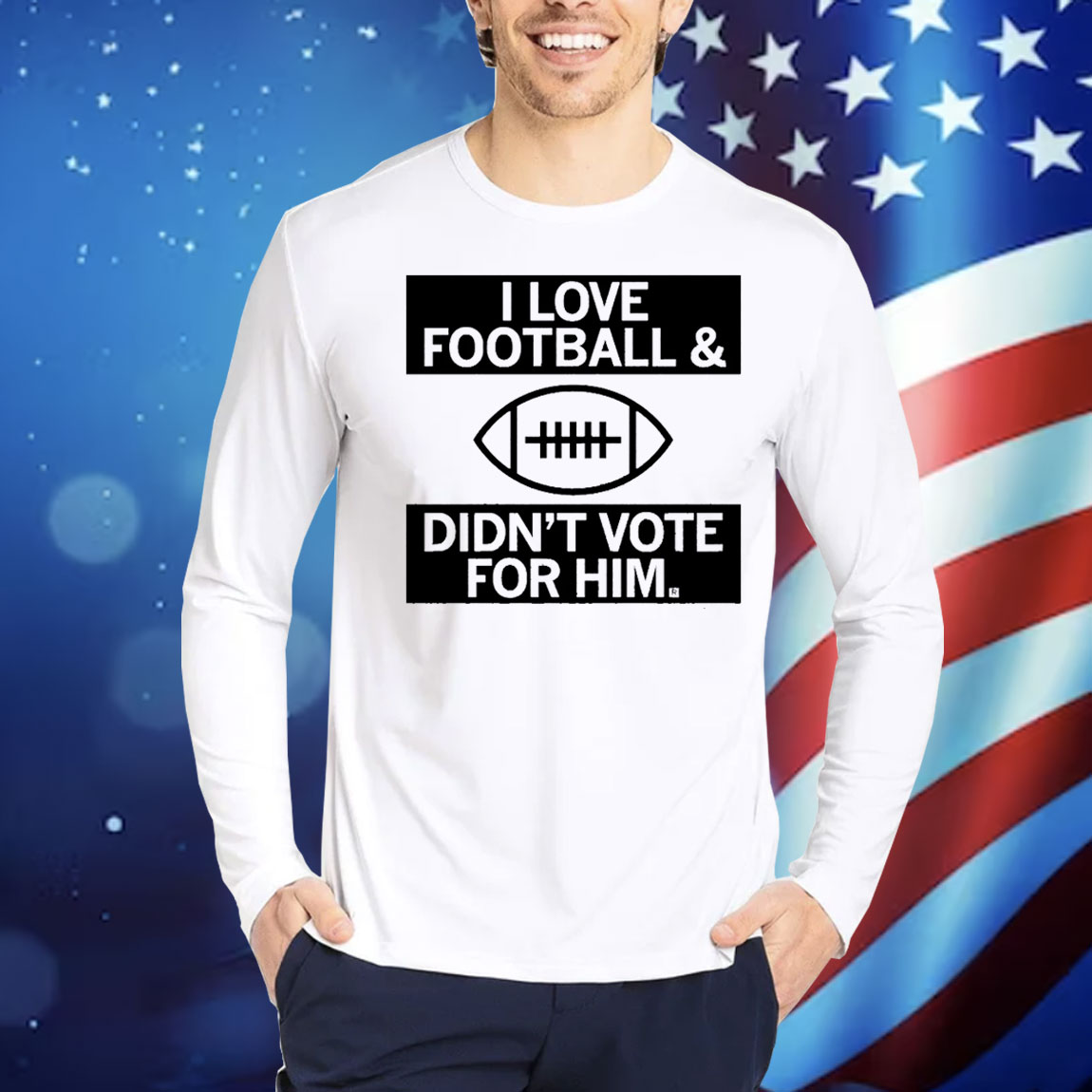Features the statement “I Love Football And Didn’t Vote For Him” in strong, readable lettering. -
