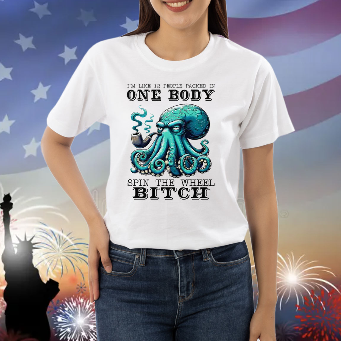 • Eye-Catching Graphic: Features the bold and playful phrase “I’m Like 12 People Packed In One Body Spin The Wheel Bitch” in a stylish design.