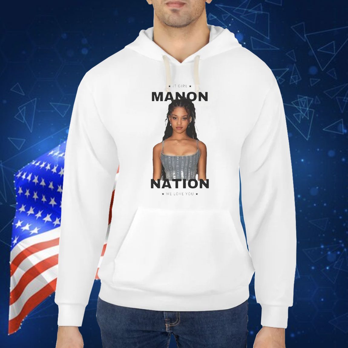 - Emblazoned with the bold and vibrant “Manon Nation We Love You” slogan, this shirt exudes confidence and style.