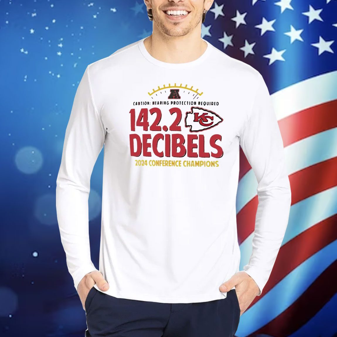 Kansas City Chiefs caution hearing protection required 142.2 decibels 2024 conference champions Shirt