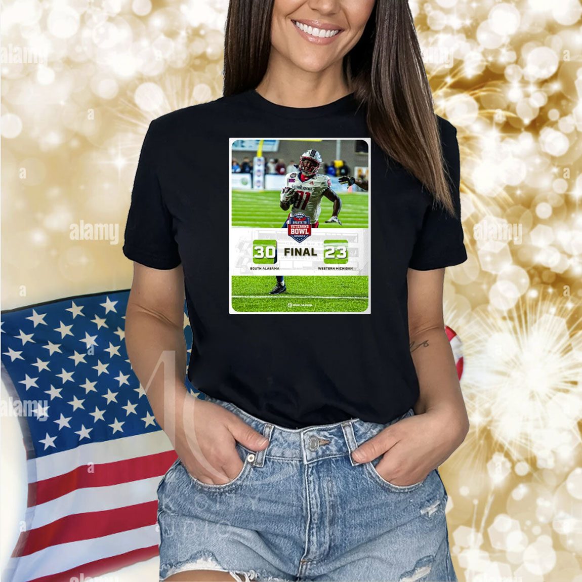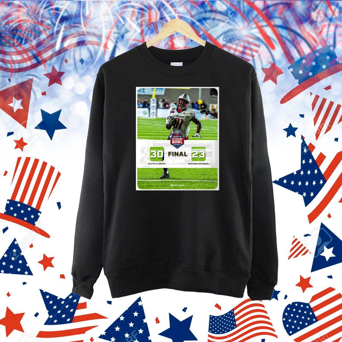 Don’t miss out on this opportunity to own a piece of South Alabama football history. Order your Official Final South Alabama Jaguars vs. Western Michigan Broncos 30 – 23 Score 2024 IS4S Salute to Veterans Bowl Poster Shirt today and celebrate the Jaguars’ victory while honoring our veterans.