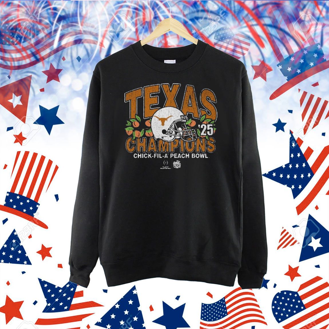 Bold Texas Longhorns logo and “2025 Peach Bowl Champions” print