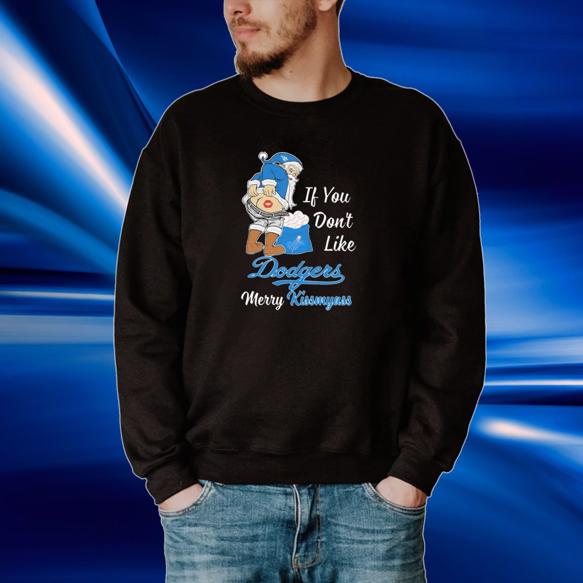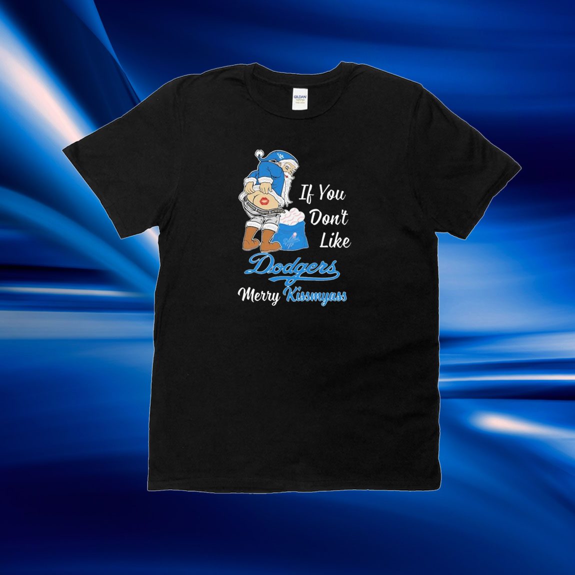 Introducing the Santa Butt “If you don’t like Los Angeles Dodgers Merry Kissmyass Christmas Tee Shirt” – a festive and humorous way to celebrate the holiday season while showing off your team spirit!